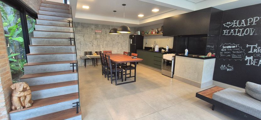 sobrado semi mobiliado - fachada clássica e contemporanea - 2 vagas cobertas para SUV e 2 descobertas, corredores laterais - entrando por alta em aluminio com fechadura eletrônica - hall e lavabo, a frente escada em madeira e ferro que dá acesso aos dormitórios e também ao espaço gouremet e quintal