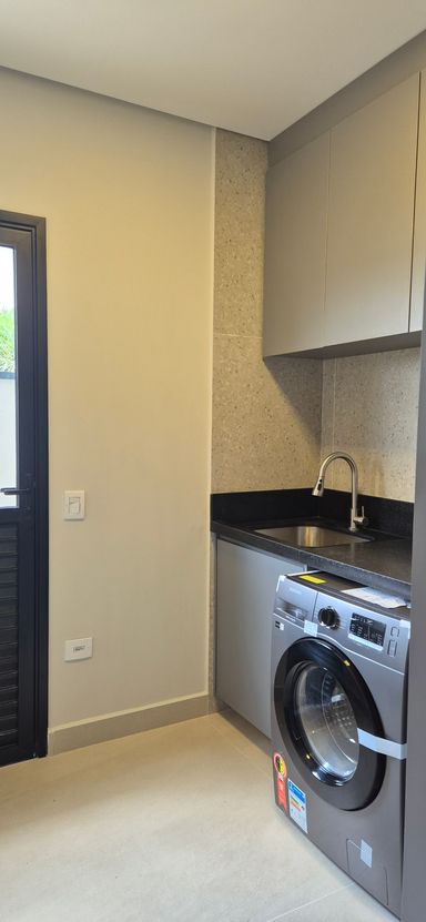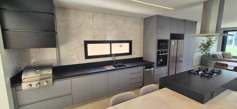 com moveis planejados na cozinha e espaço gourmet que é integrado a cozinha, todos os eletrodomésticos da cozinha, área de serviço com maquina e espaço gourmet completo, inclusive alguns moveis como sofá e mesa de jantar