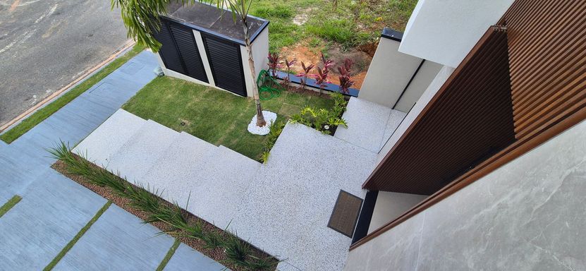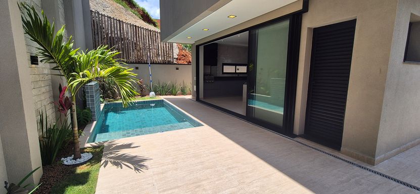 sala integrada entre estar, jantar e gourmet e tudo isso servido por uma linda cozinha aberta , área de serviço, deposito que pode ser também uma bela dispensa, banheiro externo para uso da piscina e prestadores de serviços, lavabo, escada elegante, piscina com cascata e paisagismo que torna ainda mais belo o projeto, garagem coberta para 2 veículos grandes, deposito na garagem e acesso protegido que faz toda diferença em dias de chuva!