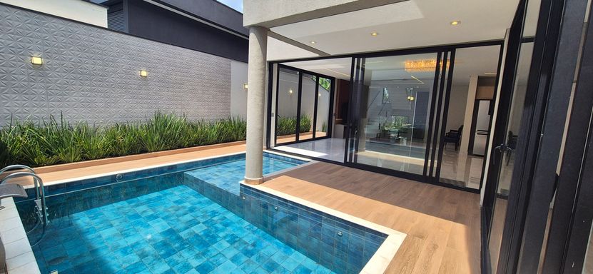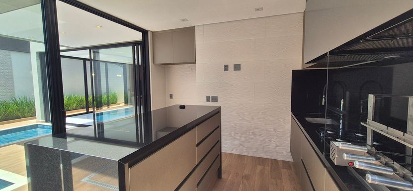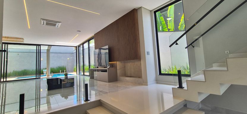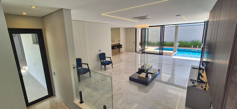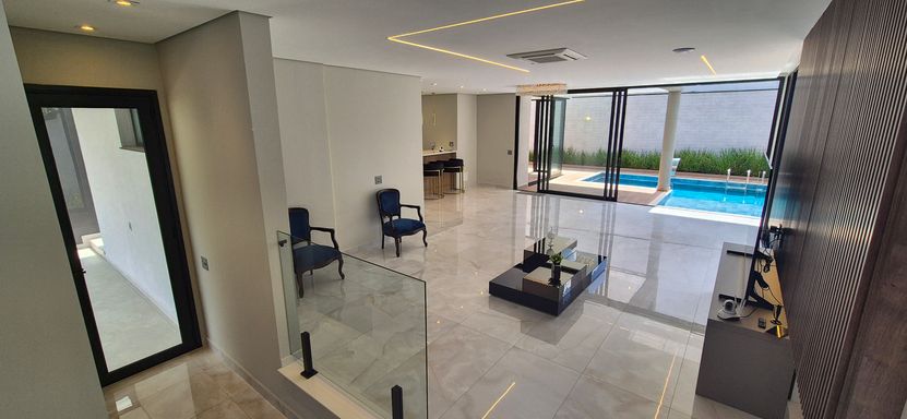 sala integrada com até 3 ambientes sendo 1 o espaço gourmet e tudo isso servido por uma linda cozinha aberta , área de serviço, deposito que pode ser também uma bela dispensa, banheiro externo para uso da piscina e prestadores de serviços, lavabo, escada elegante, piscina grande com cascata e paisagismo que torna ainda mais belo o projeto, garagem coberta para 2 veículos grandes com acesso direto entre a sala e garagem que faz toda diferença em dias de chuva!